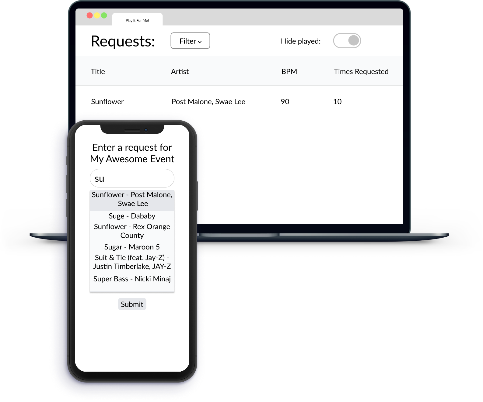 Did you ever wish you could easily see which songs your audience want to hear and pick the ones that fit perfectly into your set? The wait is over! Filter requests by bpm and artist. Hide requests that you've already played. Have the most requested songs show up first. Best of all? Guests can easily make requests from their phones with personalized QR codes and no app and you avoid frustrating interactions at the booth!